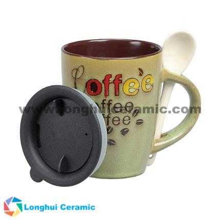12oz handpainted promotional ceramic coffee cup with spoon and lid