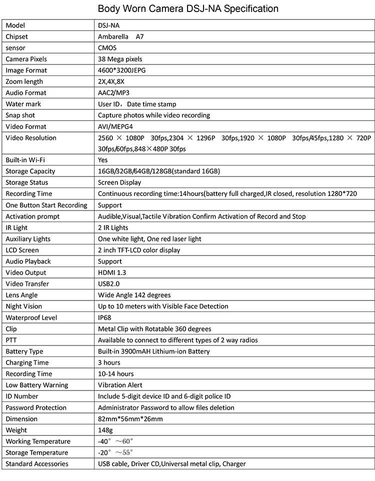 The body cameras are the portable devices that can record video and audio. The devices can also transmit live video and audio through 3G or 4G, do live tracking with GPS. The devices have a TFT monitor and buttons on it and user can operate the device easily. The body cameras are usually used by police man, security guard, and other law enforcement officers.