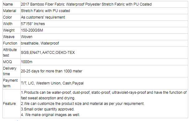 X4039 2017 Bamboo Fiber Fabric Waterproof Polyester Stretch Fabric with PU Coated