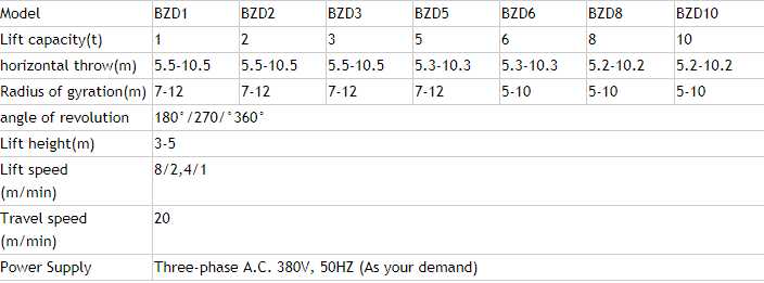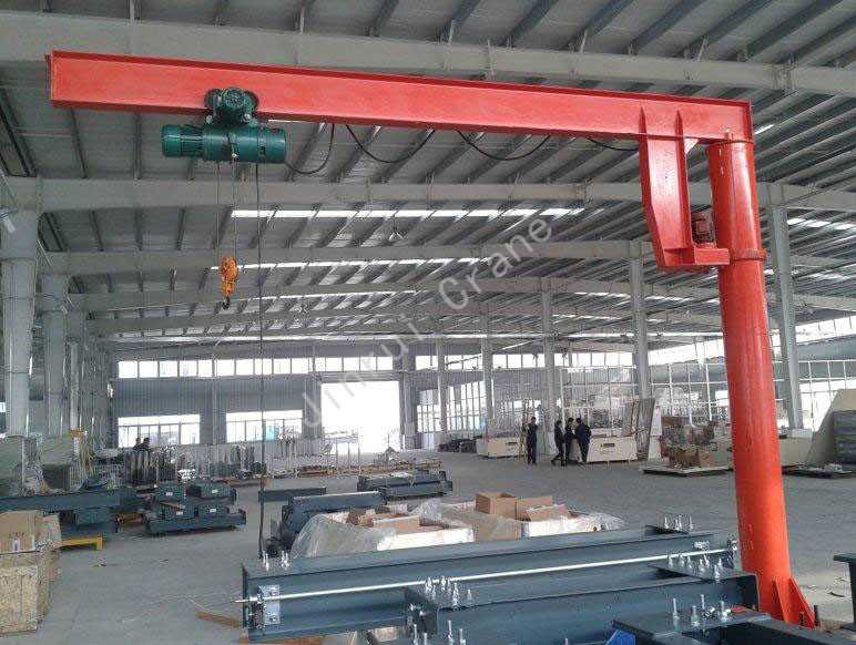 Jib crane is composed by the vertical shaft, revolving arm, rotating shaft, hoist, the bottom of the vertical shaft is fixed on the concrete base. Revolving arm driven by cycloidal pinwheel reducer, electric hoist on the cantilever beam as a straight line running from left to right, and lifting heavy objects.It has two types,one is BZD type,it is used with wire rope electric hoist.The other type is BZN model, it is used with chain electric hoist.