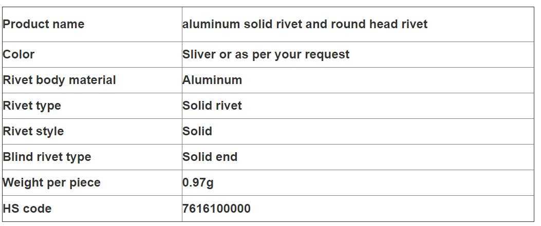 Hot sale hardware products aluminum solid rivet and round head rivet