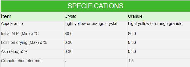 Light yellow or orange crystal (granule). No poison with a little odor of ammonia. The density is 1.34-1.40. Soluble in benzene, acetone. chloroform, insoluble in water and acid, alkali with lower concentration.