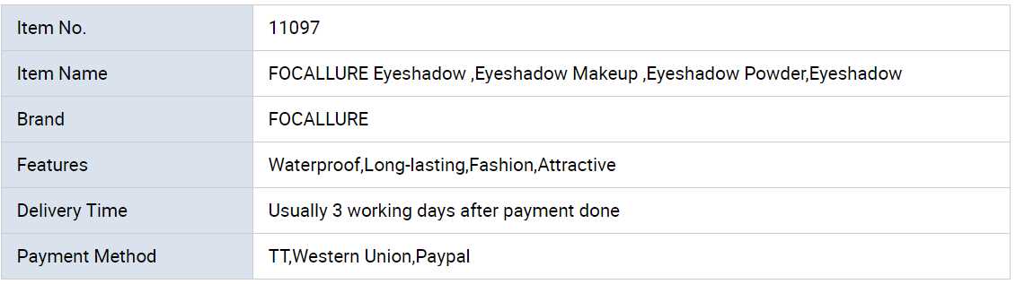 Main Products:FOCALLURE Eyeshadow,FOCALLURE Makeup Powder,FOCALLURE Lipstick,FOCALLURE Foundation,FOCALLURE Blusher