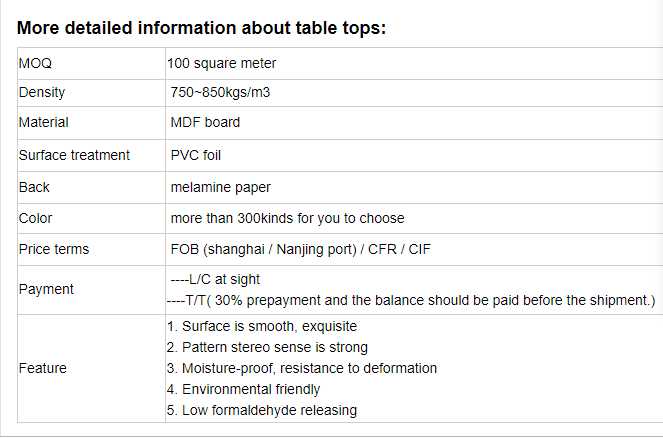 Our table tops are made of wood grain or solid color PVC film pressed MDF 15mm to 25mm E1/E2/CARB2. Our factory can make good quality table tops with the most competetive price.