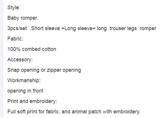 Our baby rompers have the latest styles,which have 3 pcs/set,short sleeves and long trouser legs romper.they are all made of 100% combed cotton,full soft print for fabric and animal patch with embroidery.they are comfortble and soft,giving the best experiences when wearing ,they are also very friendly-environmently,safe and healthy. in addition ,they have various colors ,which can meet any child's need.