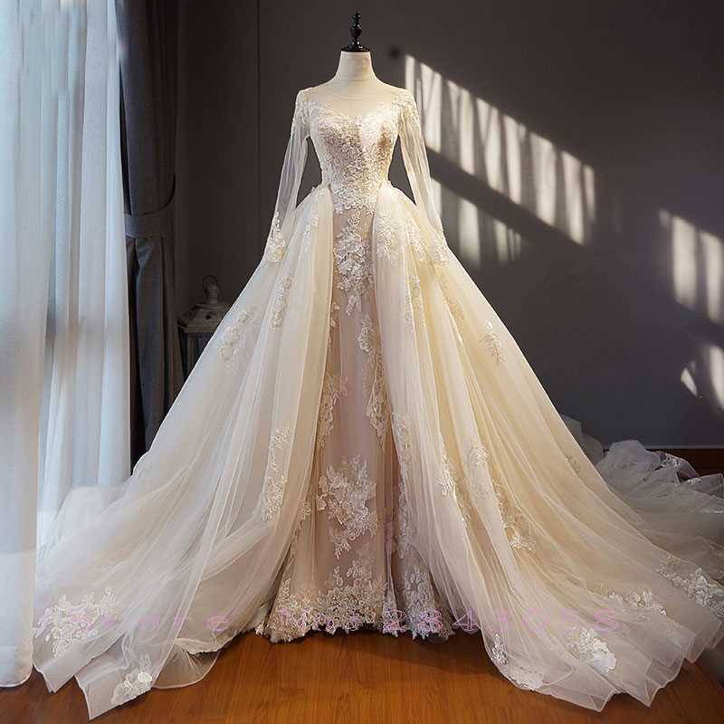 2018 Gorgeous Illusion Long Sleeve Wedding Dress With Detachable Train Exquisite Embroidery Applique Robe de Mariage sale