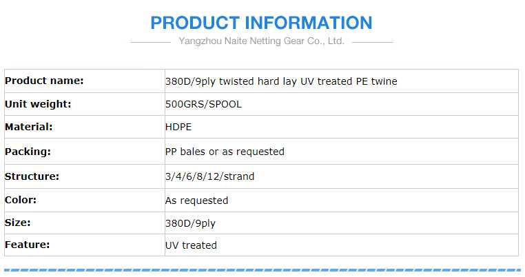380D/9ply twisted hard lay UV treated PE twine for sale
