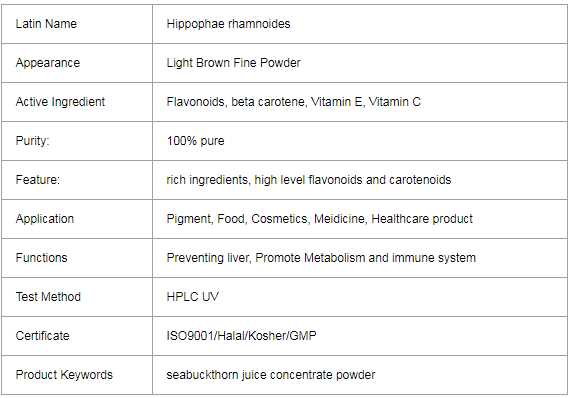Seabuckthorn fruit powder is made through spray drying of sea buckthorn fruit juice. It is easy to store, transport and use and is rich in nutritional ingredients. Every gram of seabuckthorn fruit powder may contain up to 100mg of sea buckthorn fruit acid.