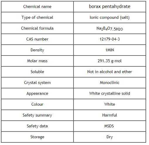 Borax Pentahydrate comprises of 5 mol water. It is stated also as sodium tetraborate pentahydrate, disodium tetraborate pentahydrate, borax 5 mole. Borax Pentahydrate, chemical formula is Na2B4O7.5H2O, is white, odorless and granular. Consists of white crystalline granules or powder. It is mildly alkaline in solution. The advantages of this material vs. the decahydrate form lie in the lower transportation, handling and storage costs of a more concentrated product. 74.6 lb. of this material are equivalent to 100 lb. of decahydrate.