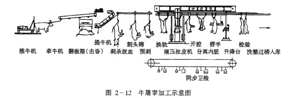 live cattle in slaughtering shed →feed deprivation for 24 hours →weighing → washing→stun the cattle with head fixed →lift by tying one hind leg →bloodletting → blood draining for 5-6 mins → electrical stimulation → cut forelegs and horns / head pre-dehiding →seal the anus →cut hind leg / change rail → stretch legs after entering the carcass automatic processing conveyor →pre-stripping →machinery mechanical peeling→cattle held in temporary storage room→