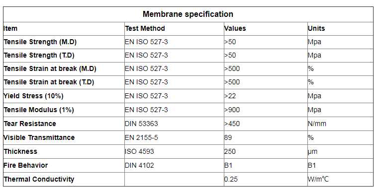 ETFE is a fluoropolymer film, which provides an outstanding combination of properties that makes it an ideal material in membrane construction. Light and UV-permeability, flame resistance, and the self-cleaning effect are the most important properties which this material offers. While the film is extremely light weight, it can handle large weight loads making it an all-around high performance item. The durability and longevity of this product offer an economic advantage. In additional, an ETFE roof is almost completely recyclable, making it an important part of sustainable building practices.
