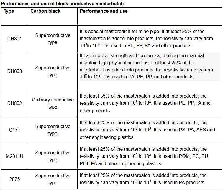 1. Using PE or macromolecular material as the carrier, conductive carbon black masterbatch is composed of effective conductive carbon black, conductive synergy additives and so on.