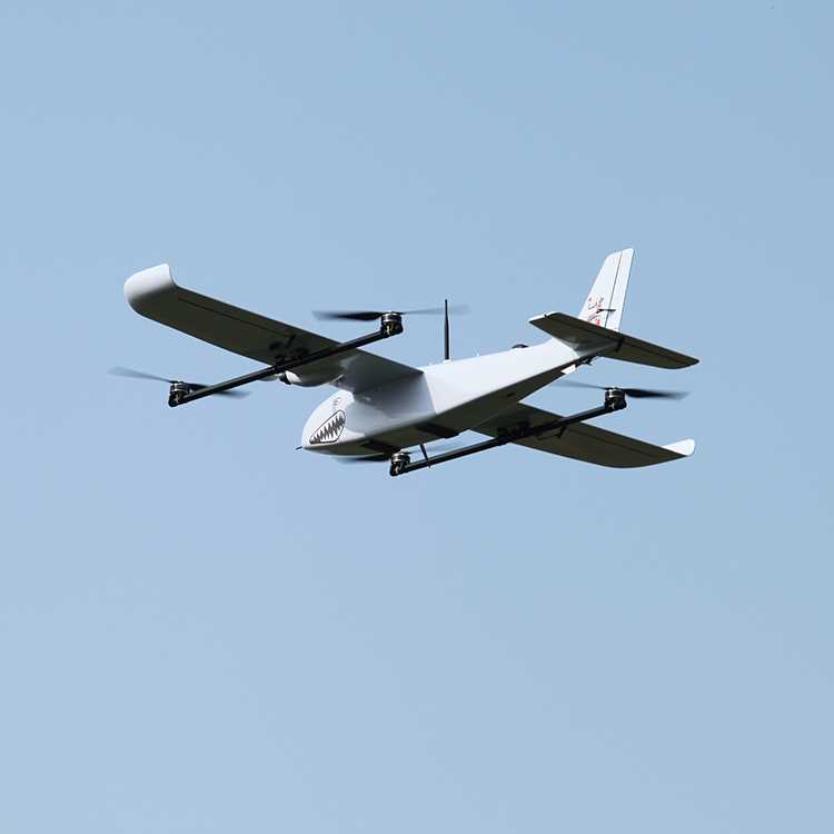 Flying shark UAV is hybrid UAV between fixed wing airplane and multi-copter. It can take off and land vertically like a multi-copter and transition to efficient and fast forward flight like fixed wing UAV. Flying shark combines the advantages from fixed wing, such as high speed, long endurance and long voyage and VTOL features from multi-copters. Vertical lift motors and rotors are mounted to each wing to provide vertical lift for takeoff and landing. Vertical lift motors are shuted off for winged flight and propellers are feathered longitudinally forminimum drag.Flying shark requires no special launch equipment and do not require runways for launch or landing. Transition to winged flight and VTOL are fully autonomous controlled through patent autopilot system. Flying shark is widely applied for aerial mapping, aerial surveying, aerial surveillance and inspection under extr