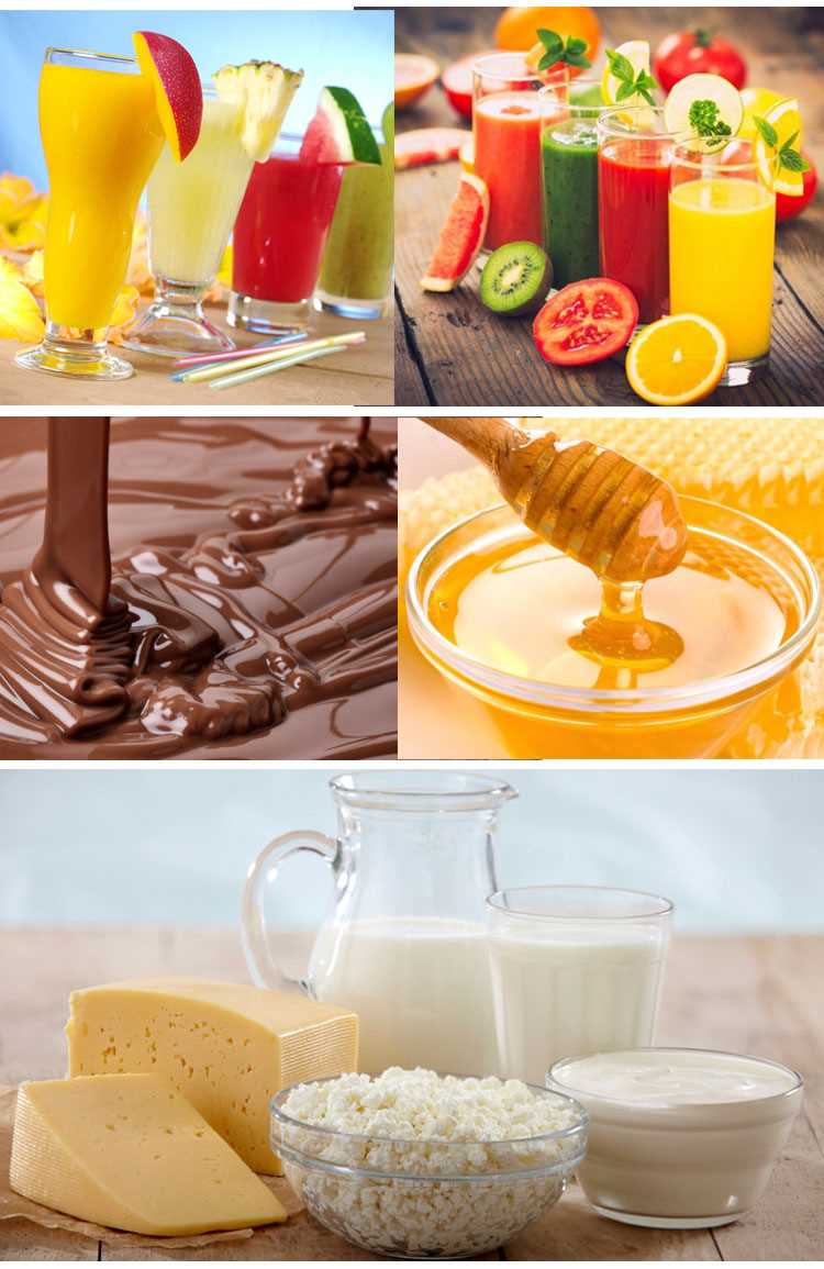 Candy: syrup, cream stuffing, fruit puree, fruit filling, pudding, jam, jelly, chocolate.