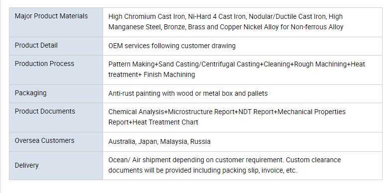 Main Products:Cast Iron,Cast Steel,Non-Ferrous Alloy,High Cr cast iron,Ni-Hard Cast Iron