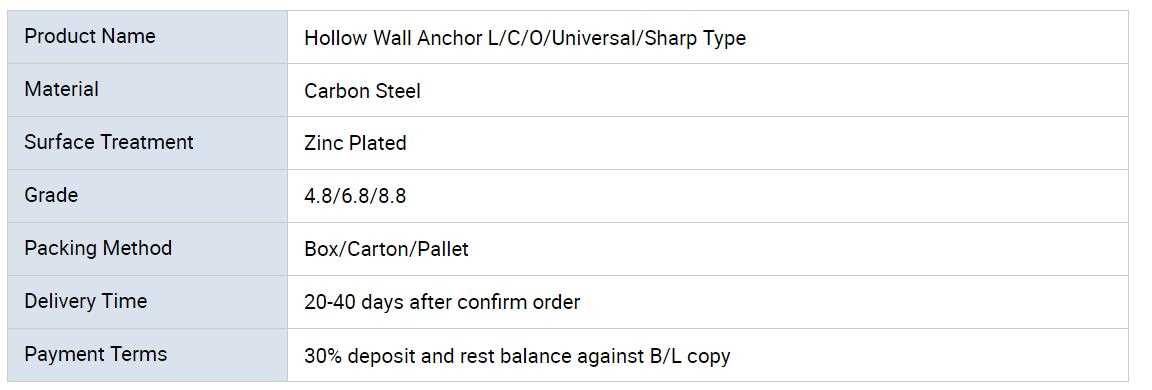 Hot Sale Factory Direct Price Hollow Wall Bolt Anchor Sharp/O/C/L/Universal Type GL