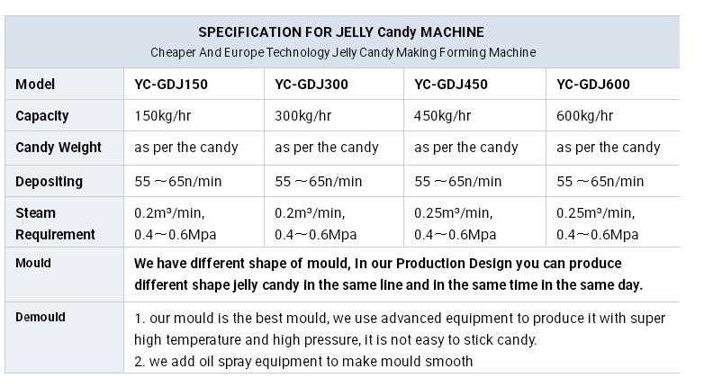 YC-GDJ150/300/450/600 full automatic servo driven PLC controlled jelly candy depositing line is the most advanced production line for deposited hard candy manufacturing. This line mainly consists of auto weighing and mixing system(optional), pressure dissolving system, JELLY CANDY cooker, depositor and cooling tunnel and adopt the advanced servo system to control the processing.