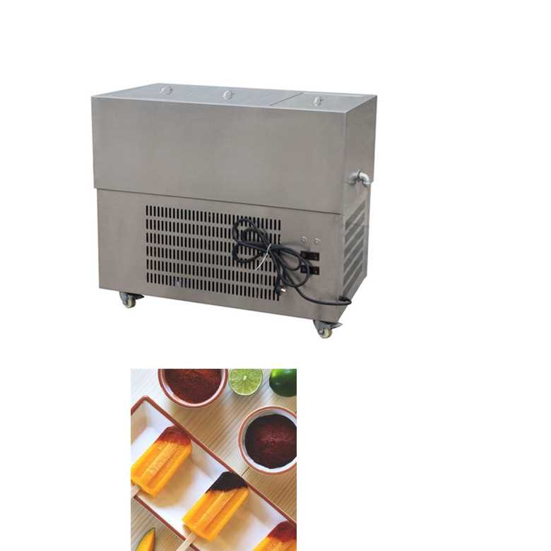 Popsicle combine equipment, with function for producing popsicle and demoulding, available single mould, two moulds,more moulds can be chosen. Produce the ice-cream finished time will depends on the Ice-cream raw materials. If for cream ice-cream raw material, production time is about 25 minutes Sugar ice cream need about 15 minutes.