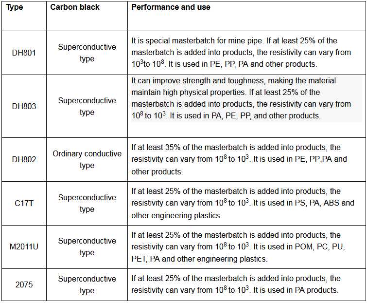 1. Using PE or macromolecular material as the carrier, conductive carbon black masterbatch is composed of effective conductive carbon black, conductive synergy additives and so on.