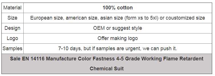 Sale EN 14116 Manufacture Color Fastness 4-5 Grade Working Flame Retardent Chemical Suit