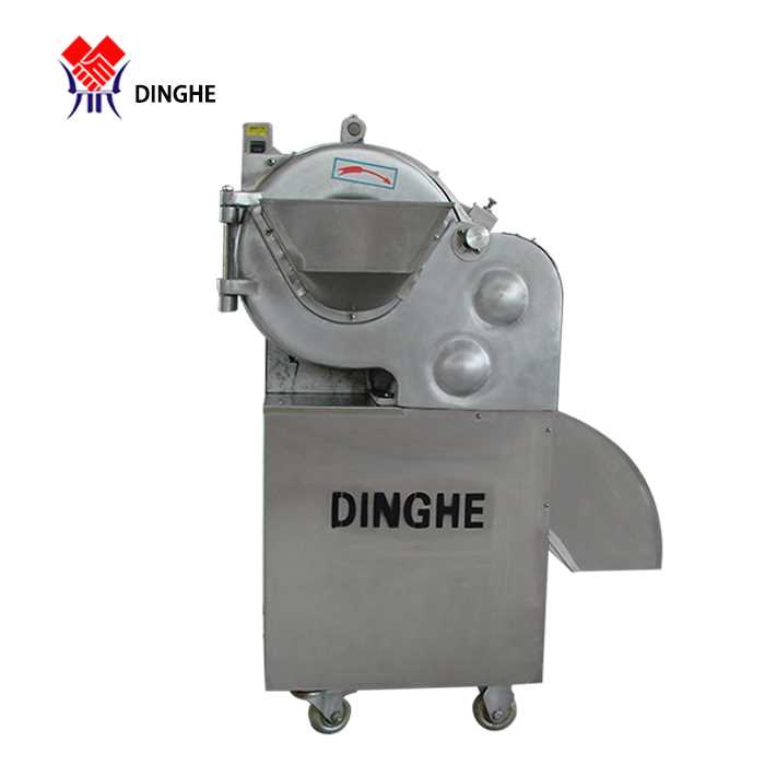 The vegetables or fruits put into the machine rotate with high speed when they are drived by the machine. Under the function of centrifugal force, they are cut into slices firstly, then they will be cut into strips by the strip cutting discs. After this, they will be transfered into the transverse cutting edge, and are cut into your wanted cubes or dices.